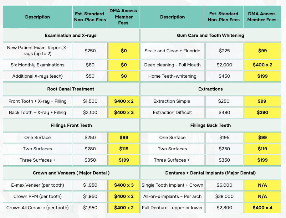 As a DMA Access member, you pay reduced fees on most general dental treatments. This includes $0 check-ups and X-rays, $99 cleans, with significant savings on more complex treatments like root canals, crowns.